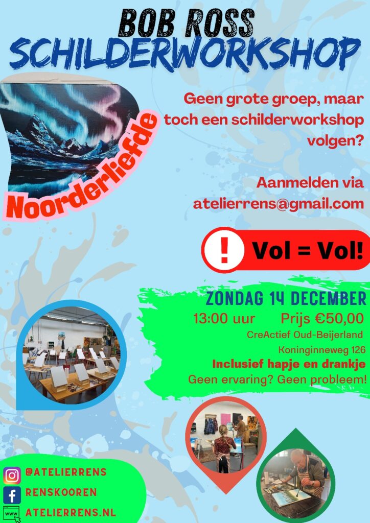 Wie kent hem niet. De Amerikaan met het afro kapsel die in de jaren 80 en 90 de mooiste schilderijen op tv maakte. Een happy, little tree, een allmighty mountain en een cozy cabin. Hij kreeg het met enkele vegen en strepen op het doek. Wil jij ook deze ervaring? Boek dan een workshop bij Atelier Rens. Klik hier voor meer informatie.